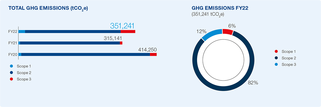 Thus, overall, there is a net reduction in GHG emissions in FY22 considering only the sources that were included in FY21 reporting. As a result, the share of Scope 1 and Scope 3 in our total emissions profile increased to 6% and 12%, respectively. Scope 2 emissions maintained 82% share in our total emissions.
