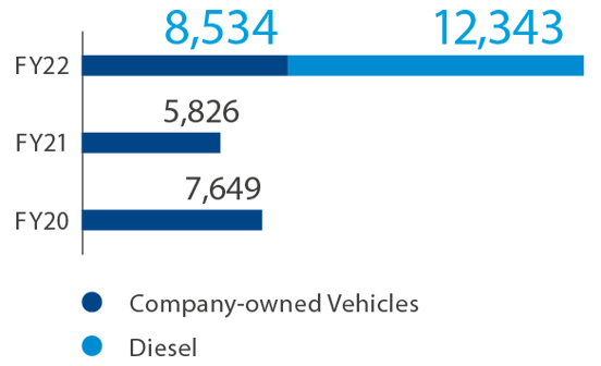 Our Scope 1 emission increased from 5,826 tCO2e in FY21 to 20,877 tCO2e in FY22, primarily on account of inclusion of emissions from diesel consumption in generators – which were previously included in Scope 2. This is because we have actual/ perceived control on the fuel consumed at a significant number of our branches and office locations. Fuel consumption in company-owned vehicles account for about 41% of our Scope 1 emissions while diesel consumption in diesel generators account for the remaining 59%.