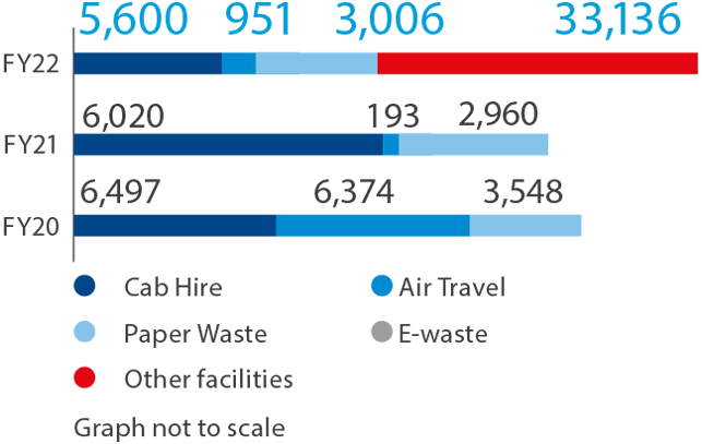 In FY22, our Scope 3 emissions increased significantly over FY21, primarily on account of inclusion of emissions due to electricity consumption at other facilities. These emissions now account for 78% of our total Scope 3 emissions. The remaining 22% of our Scope 3 emissions are split between emissions due to hired cabs (13%), air and rail travel (2%), paper waste (7%), and e-waste (<1%).