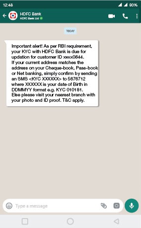 Bank will send important updates/information, regulatory alerts and service communication on WhatsApp.