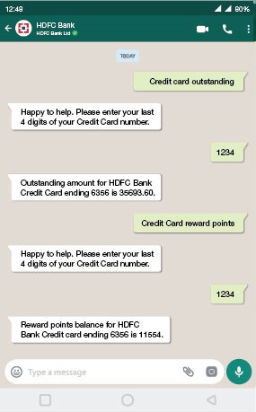 You can always avail the 2 way conversational banking services through WhatsApp.Just save the number 7070022222 for HDFC Bank in your contacts and type "Hi" in WhatsApp or type your query e.g - "Credit card outstanding balance"